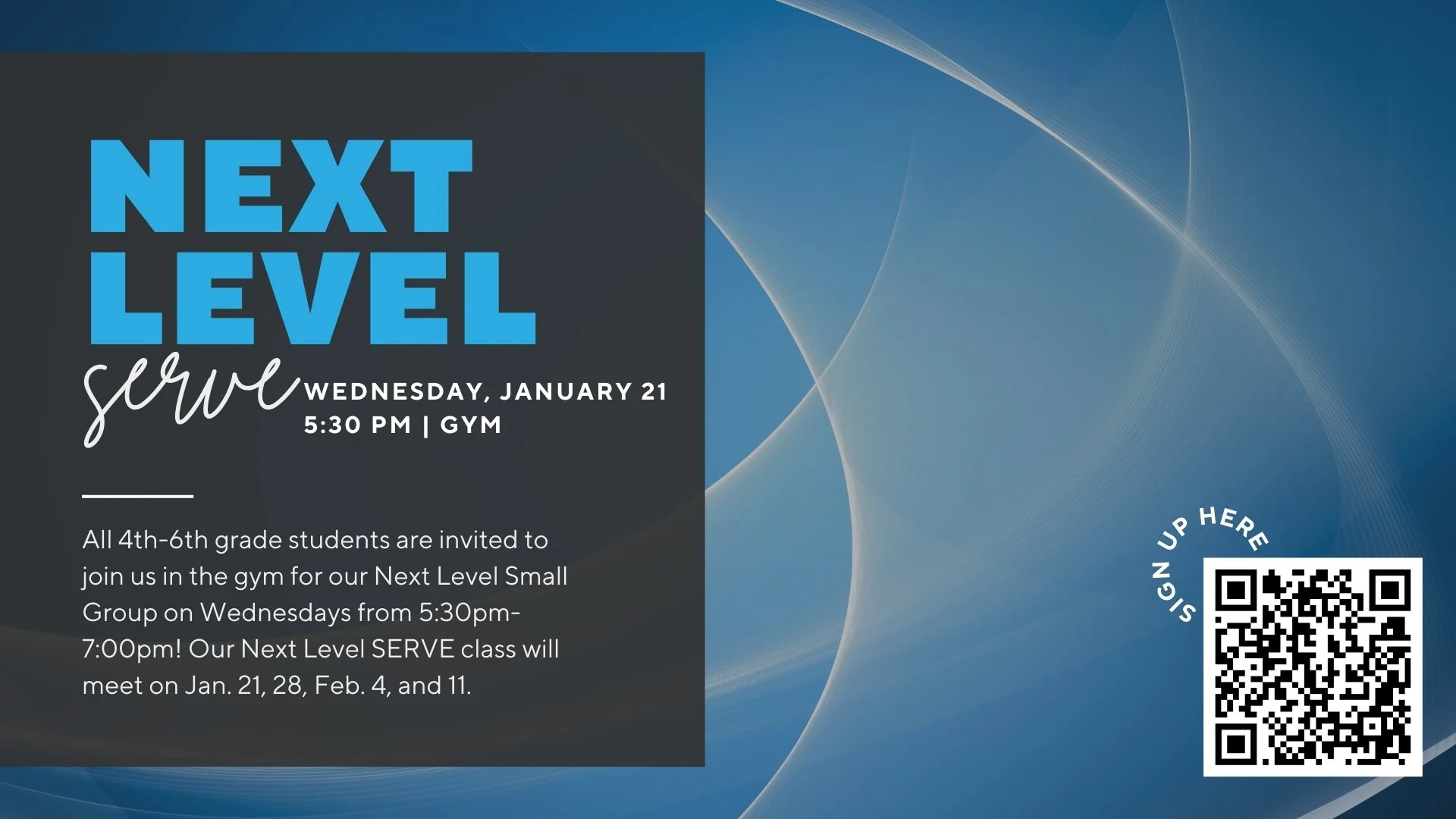 All 4th-6th grade students are invited to join us in the gym for our Next Level Small Group on Wednesdays from 5:30pm-7:00pm! We will start Part 2 in our series as we learn how to SERVE. These classes will last four weeks starting January 22nd.