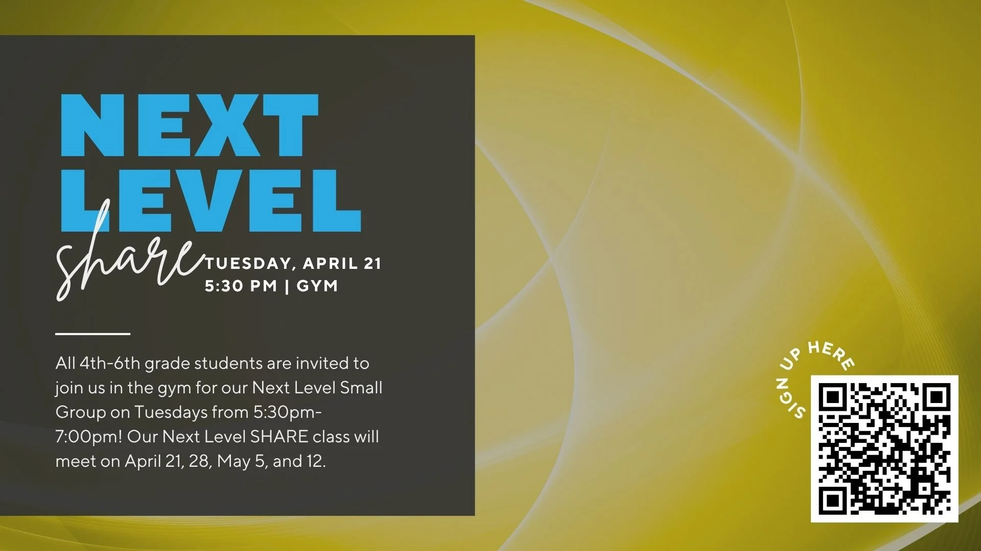 April 21 through May 12, Next Level SHARE for 4th-6th Graders, Tuesdays at 5:30 pm