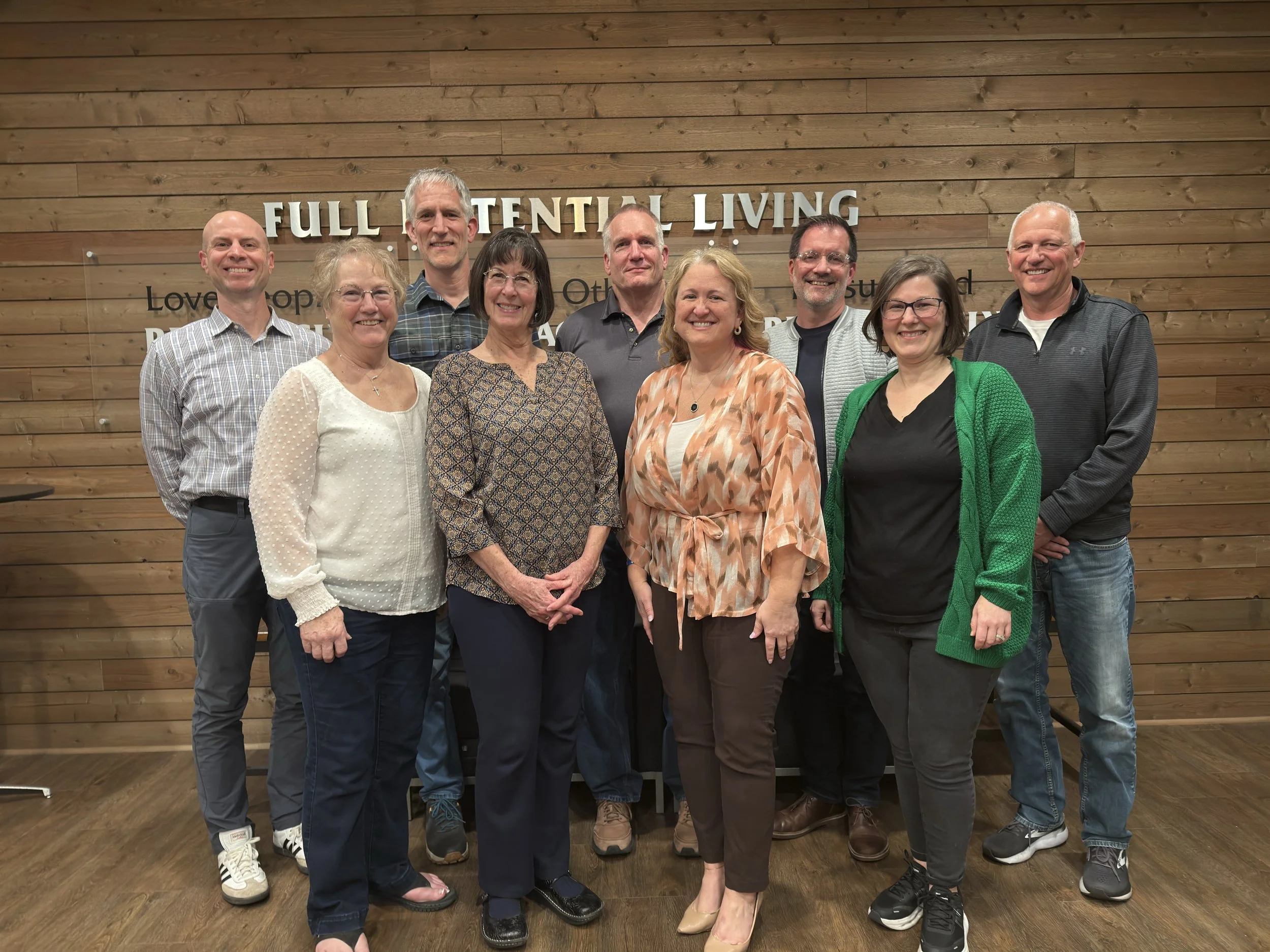 Our Church Board is elected annually to lead our church in spiritual, financial, and legal matters. Board members elected to serve through February 2026 include: (pictured from left to right): Dan Benedick, Nancy Elson, Dan Stuart, Jann Jones, Mike Watts, Maria Swinger-Inskeep, Jason Matters, Jubilee Roth & Craig Chilton. Not pictured: Kelly Amidei.